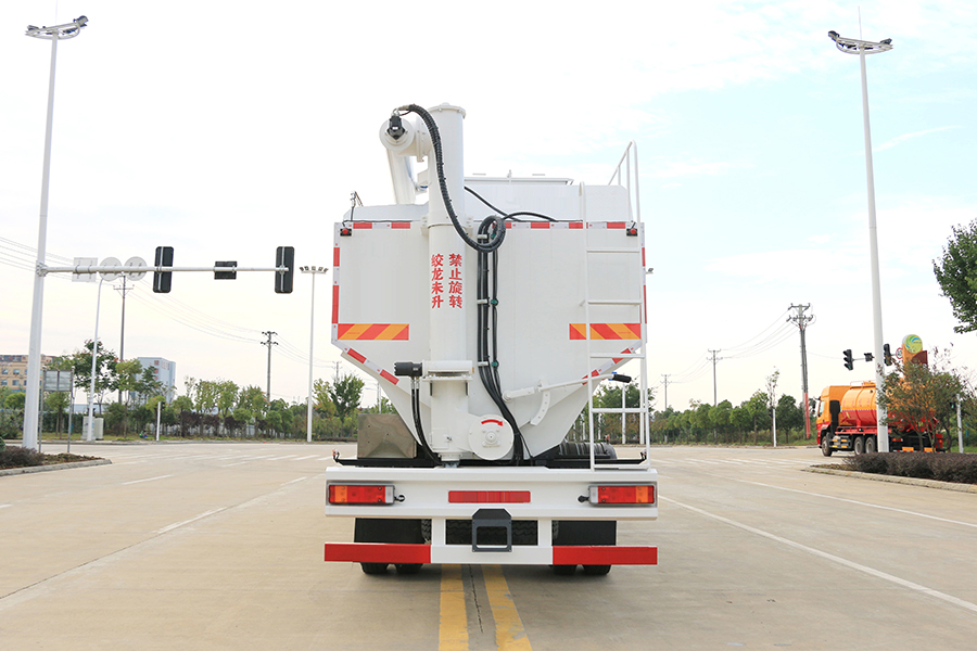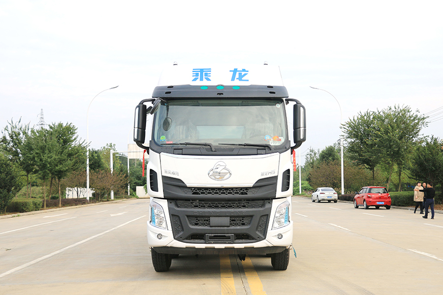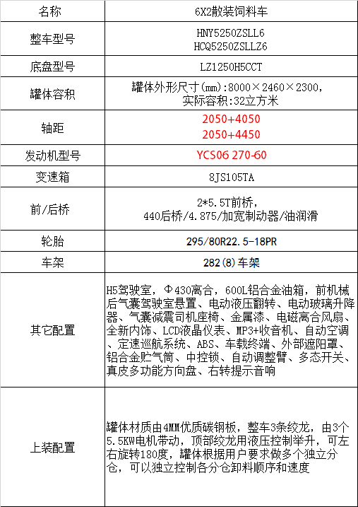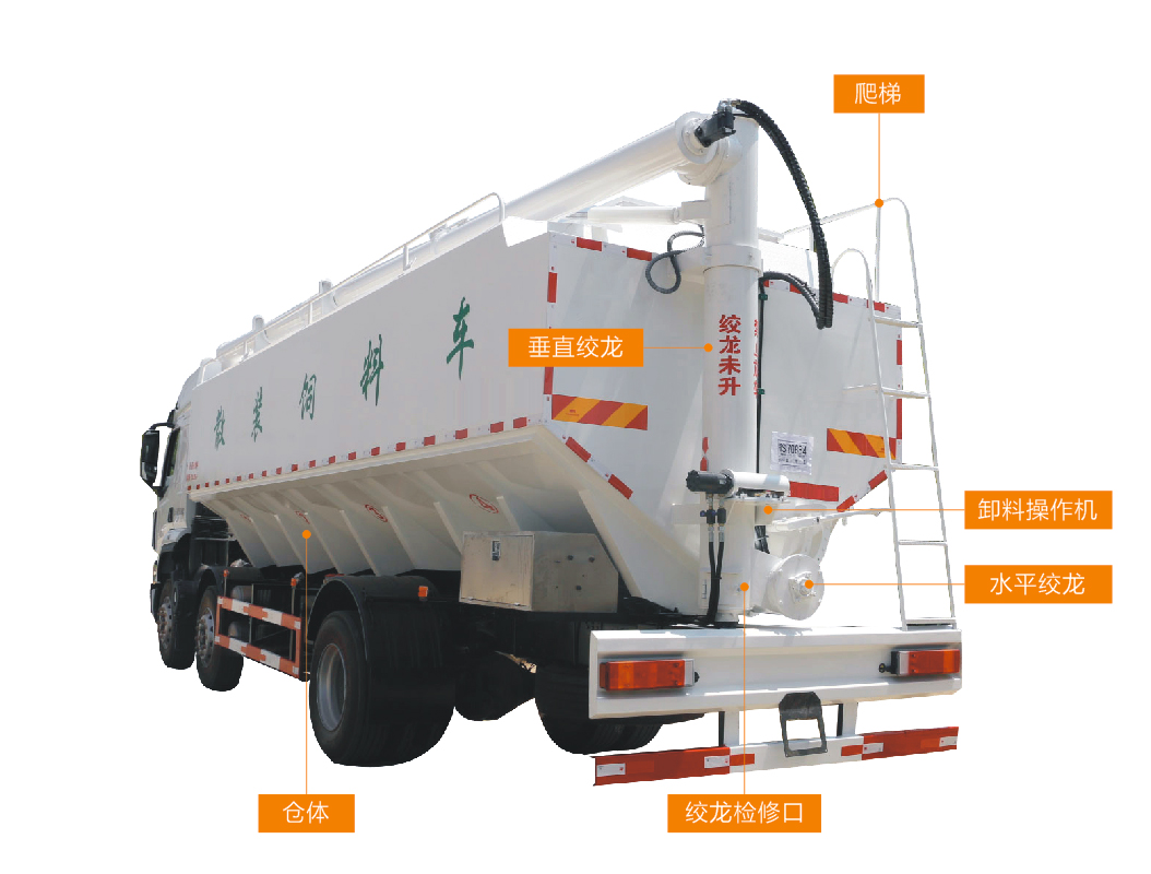 散裝飼料車的飼料罐架設(shè)在卡車的底盤上,罐頂開有進(jìn)料口.頂部的一根螺旋輸送卸料管(俗稱卸料絞龍)則可自由回轉(zhuǎn)和抬升,抬升的仰角可達(dá)60度。運(yùn)輸時(shí),頂部的螺旋管平臥在罐頂;卸料時(shí)則抬起,使管端的出料口與畜禽飼養(yǎng)場貯料罐頂部的進(jìn)料門相接,駕駛室內(nèi)裝有操縱裝置(操縱裝置也可裝置在罐體尾部),卸料時(shí)通過車底的動(dòng)力輸出軸和減速器來驅(qū)動(dòng)螺旋,以完成卸料。目前國內(nèi)主要推出3T、5T、8T、11T、15T和22T等多個(gè)噸位車型。