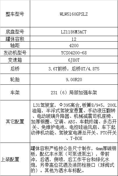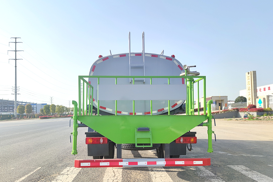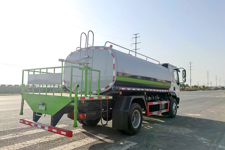 罐體采用 4mm 厚武鋼專用容積板制作,實際標(biāo)準(zhǔn)容積 12 立方-15 立方(常規(guī) 12 立方),罐內(nèi)隔板具有防波作用,以減低汽車行駛時罐體液體的沖擊。泵進(jìn)泵出,消防栓接口,前沖、后灑、側(cè)噴、后工作平臺帶綠化水炮,垂直吸程≧7 米,灑水寬度≧14 米,射程≧28 米,引水時間<5min,流量 90m3/h。自流閥、濾網(wǎng)、帶自吸自排功能。兩根等長輸水管,金屬漆,其余標(biāo)配。霧炮灑水車可選裝:30 米、40 米、50 米等以上的霧炮機(jī)。