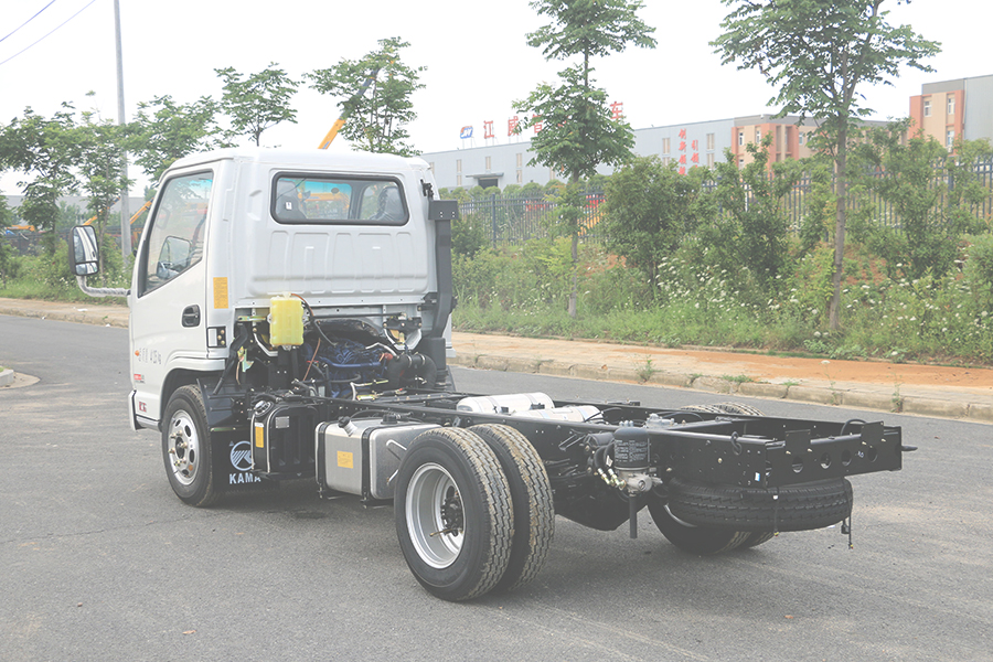 直通大梁厚度180mm,截面寬度800mm,斷面整潔布局合理,易改裝。 全鋁合金燃油油箱和儲(chǔ)氣罐,輕量化設(shè)計(jì),鋼板彈簧10mm厚,片數(shù)5+4,后橋加重型號(hào)1046BQS(3.5噸),高質(zhì)量工藝,承重性好。