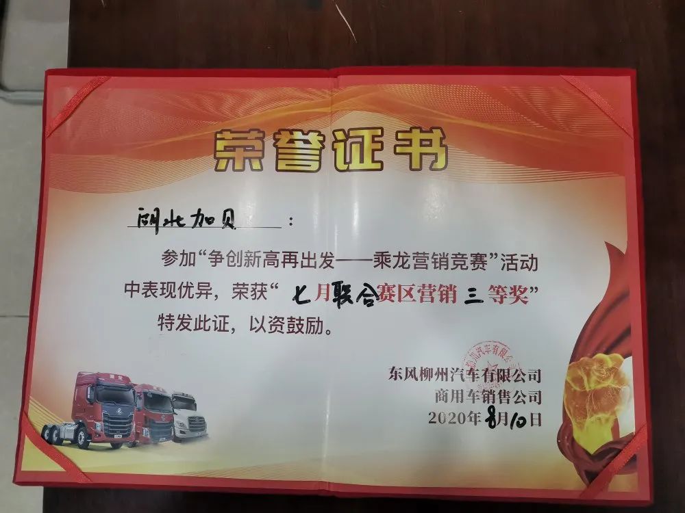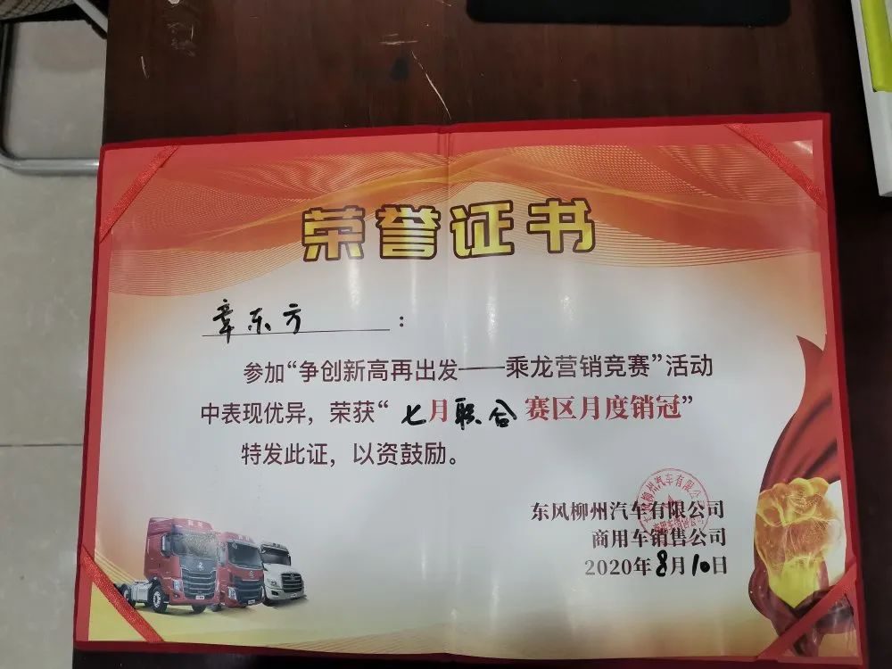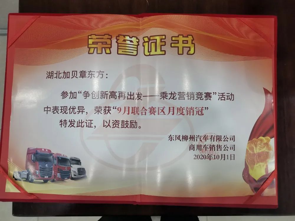 恭喜柳汽乘龍湖北加貝店和店內(nèi)的銷售團(tuán)隊經(jīng)過幾個月的不懈努力喜提柳汽榮譽證書!